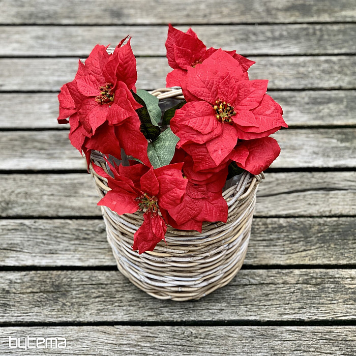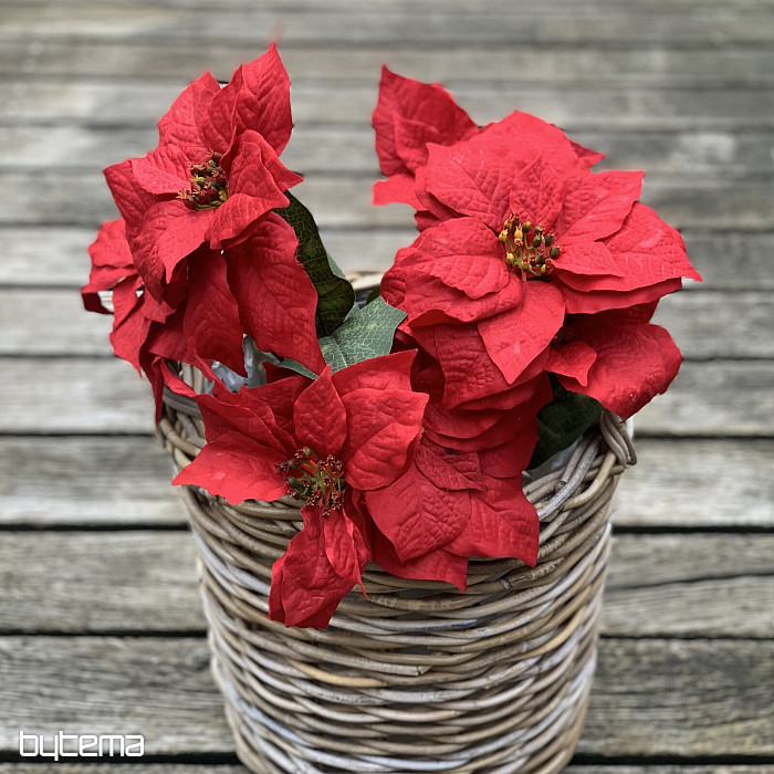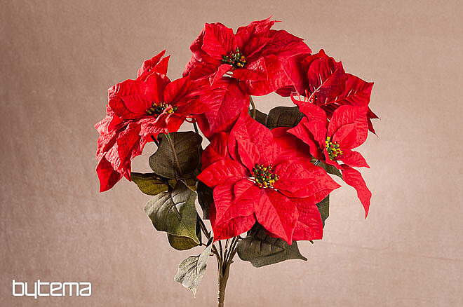 Veliki buket crvenog cvijeća uspješnog dizajna. U bogatom buketu ima sedam cvjetova i mnogo listova. Cvijet izgleda vrlo prirodno i zahvaljujući lijepom izgledu dobit ćete impresivan ukras tijekom božićne sezone.