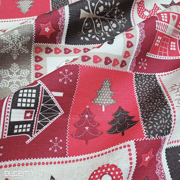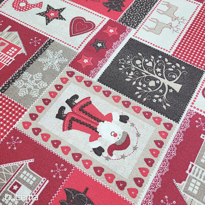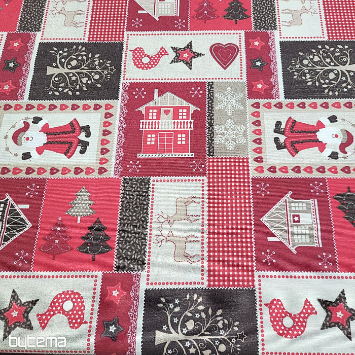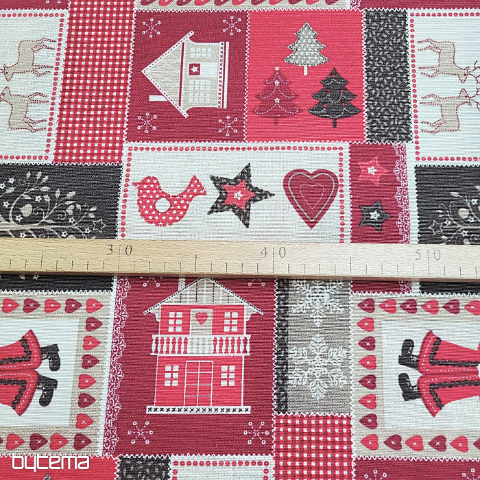 Dekorativna tkanina s božićnim patchwork dekorom, prikladna za interijere u rustikalnom i seoskom stilu.