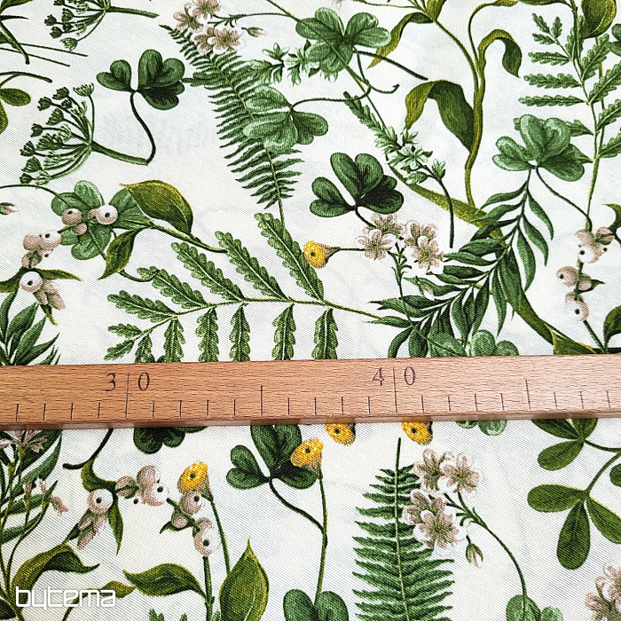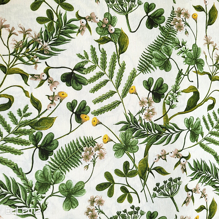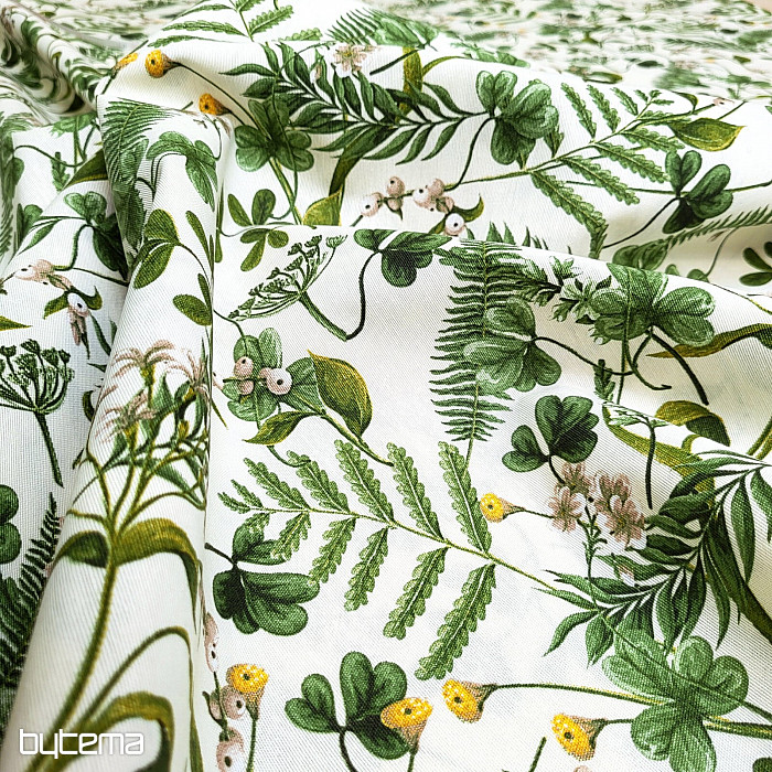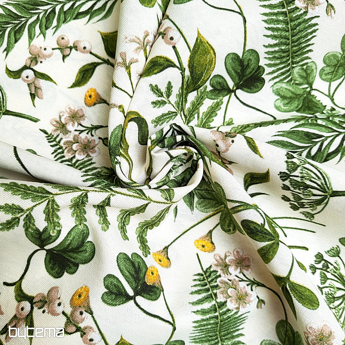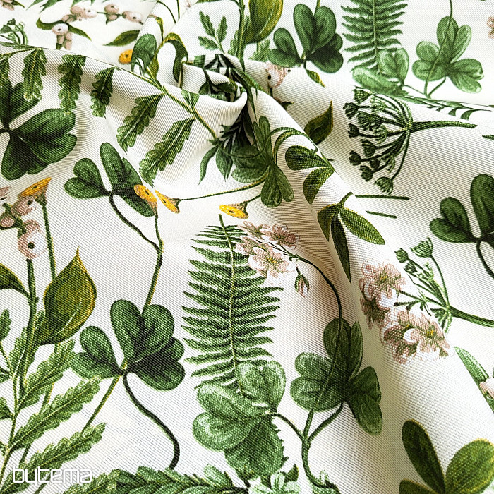 Dekorativna tkanina s divljom djetelinom i travama u tamnozelenoj boji.
