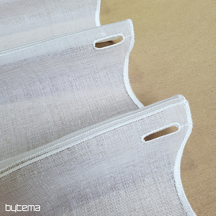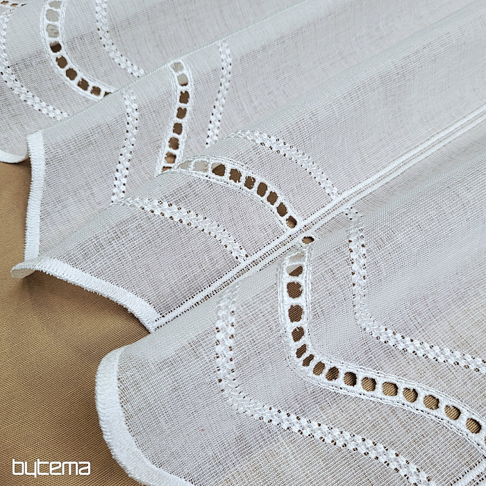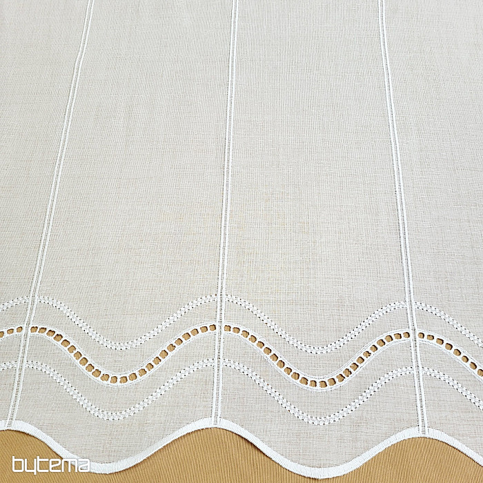 Moderna jednostavna vezena zavjesa za vitraj. Nije potrebno šivanje, jer je izrezana u vezenim linijama cca. 15 cm. Materijal ima prirodan do mekan izgled lana.
