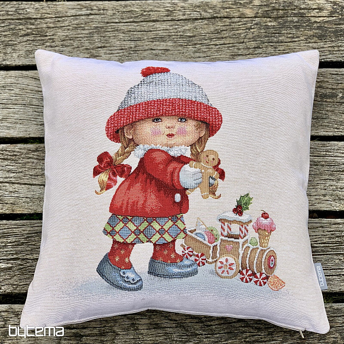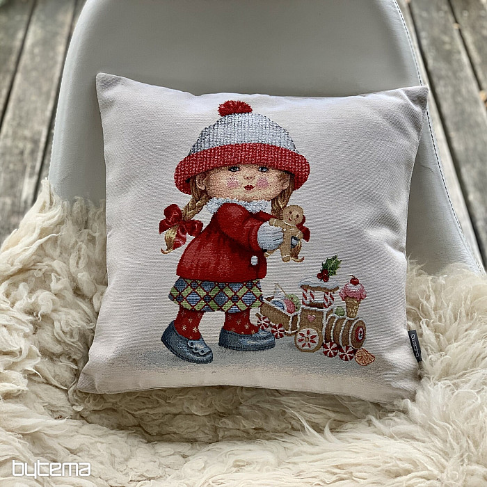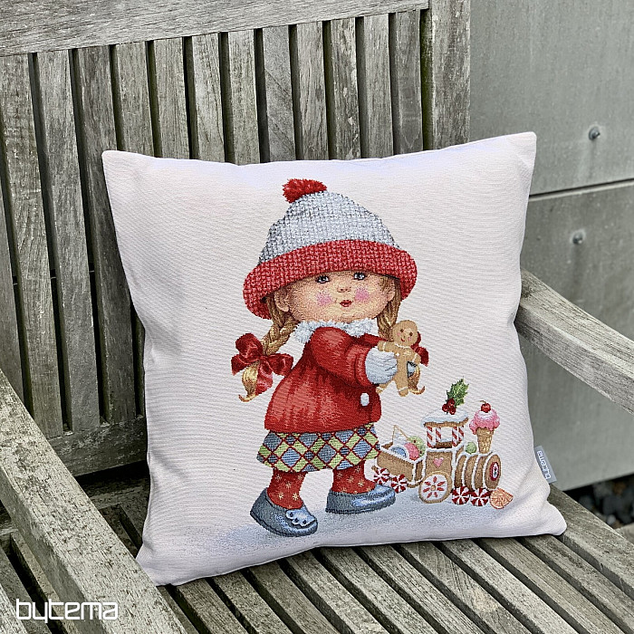 Ukrasni jastuk iz goblena sa zimskim motivom DJEVOJČICE s igračkom je tako čaroban.
