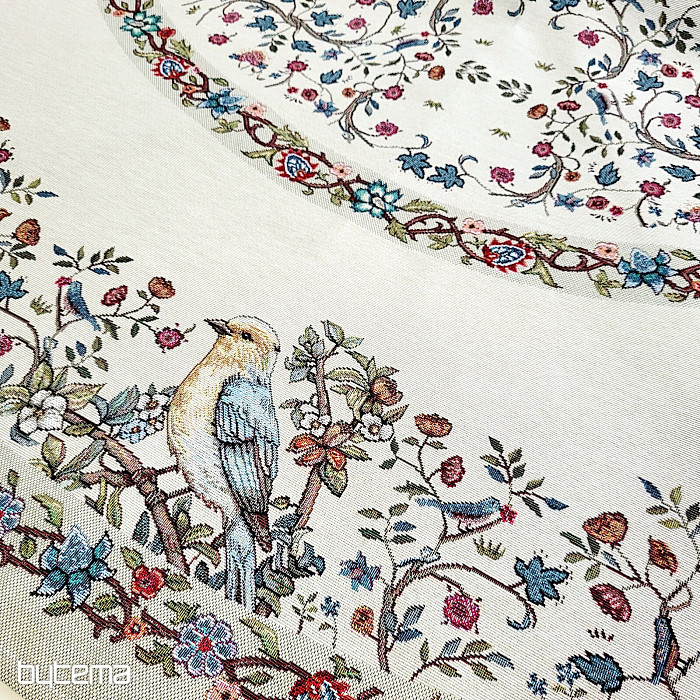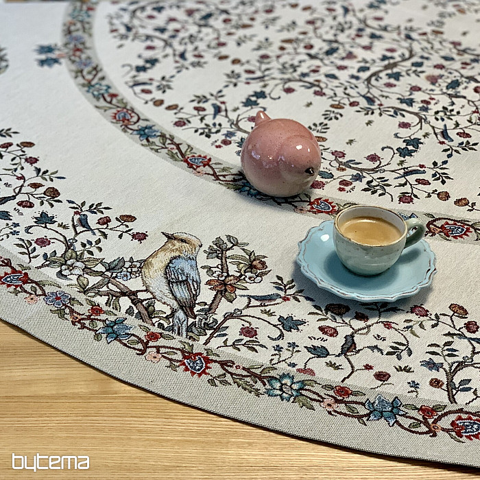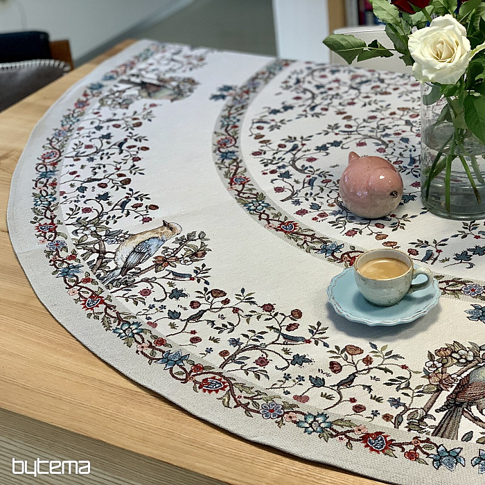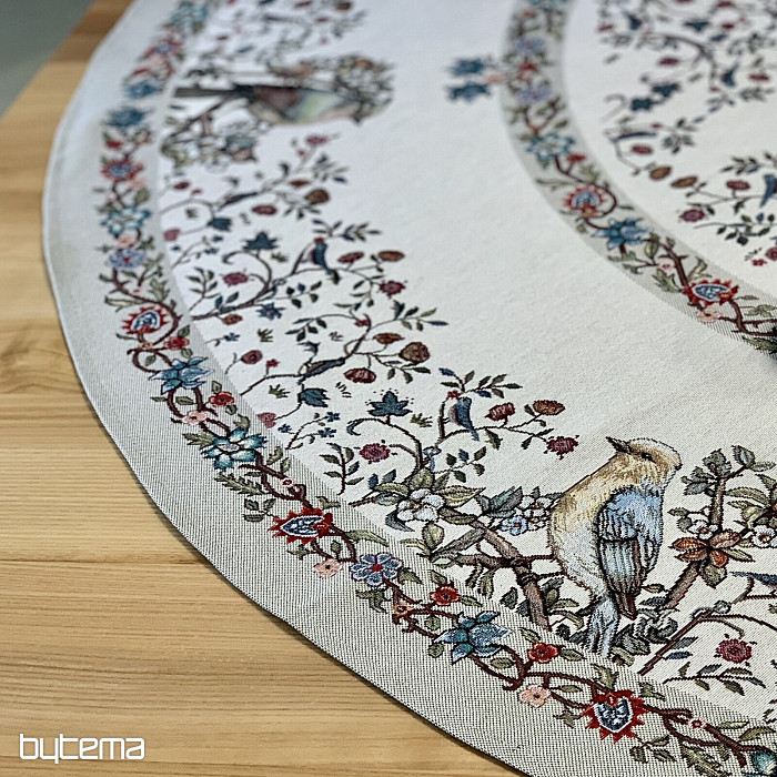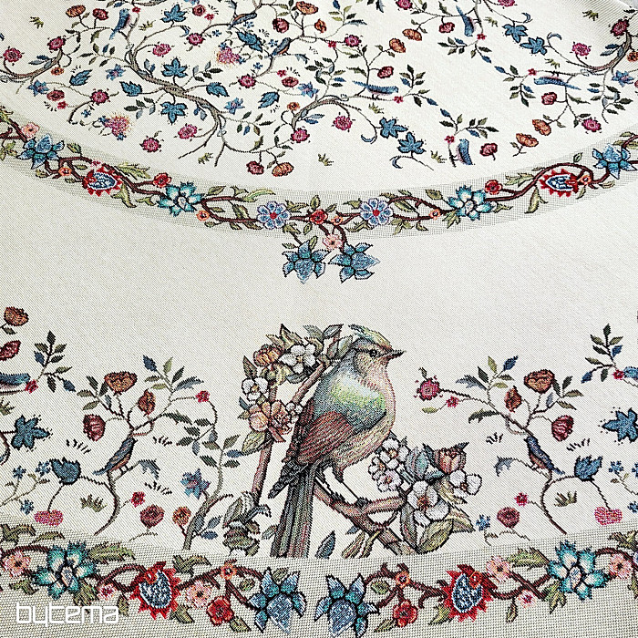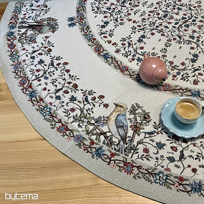 Prekrasan okrugli stolnjak izrađen od čvrste tapiserije s pticama i cvijećem u raznim bojama. Savršen dodatak ili poklon za ljubitelje ptica.
