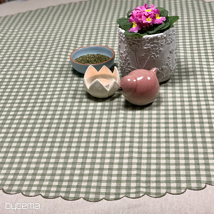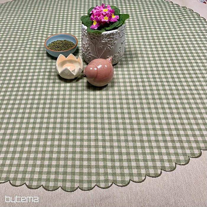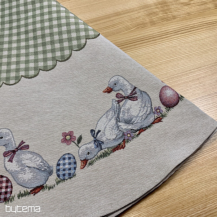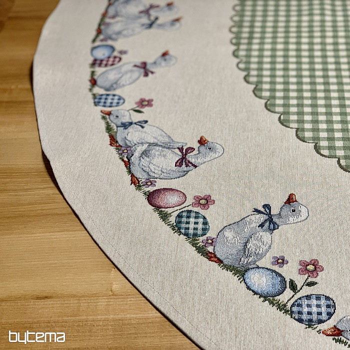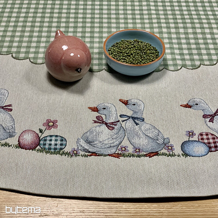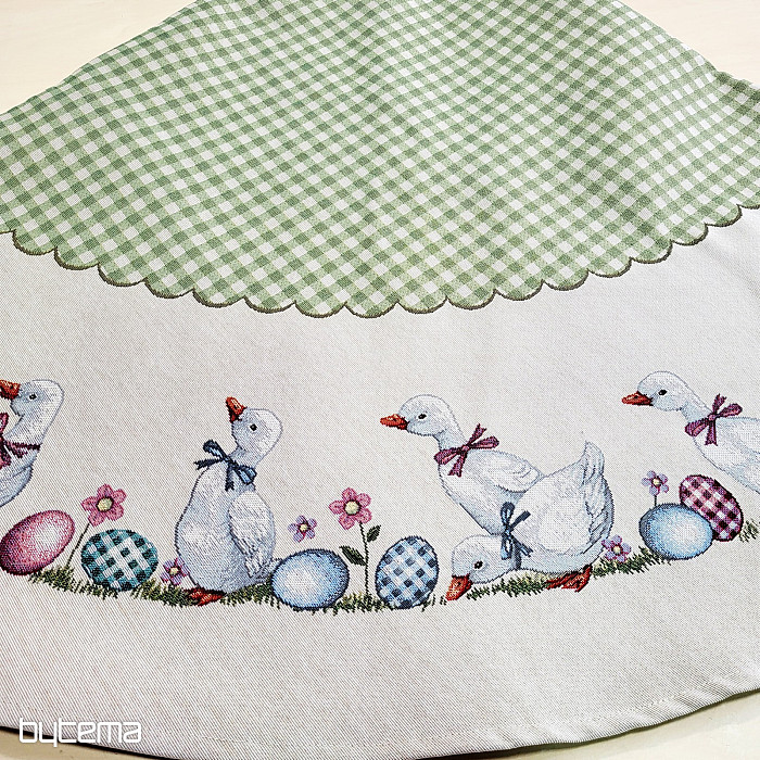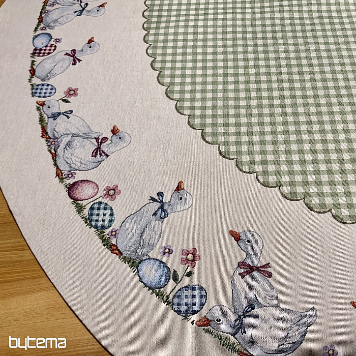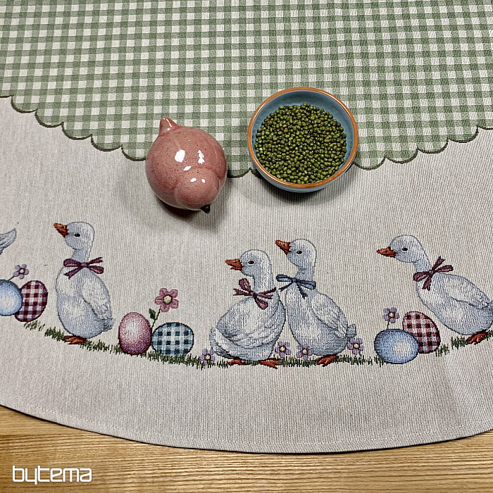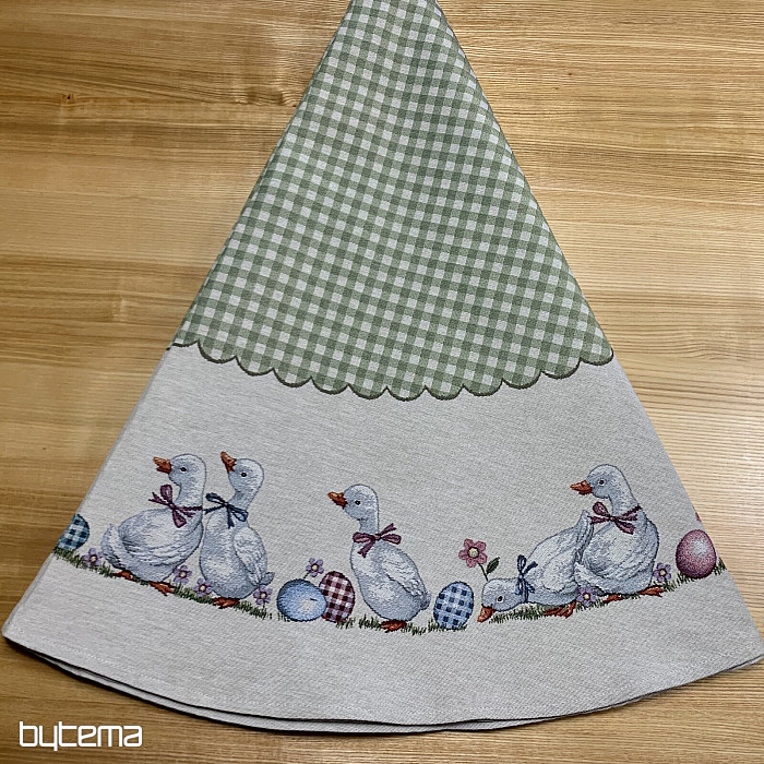 Uskršnji okrugli stolnjak od tapiserije sa zelenim kariranim uzorkom i guskama. Prekrasan ukras za vaš okrugli stol.