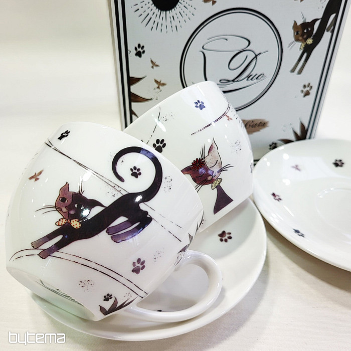 Dvije šalice od 280 ml izrađene su od porculana, kao i dva tanjurića. Cijeli set pakiran je u tiskanu papirnatu kutiju.