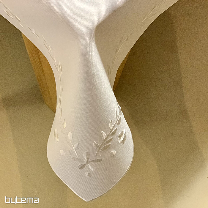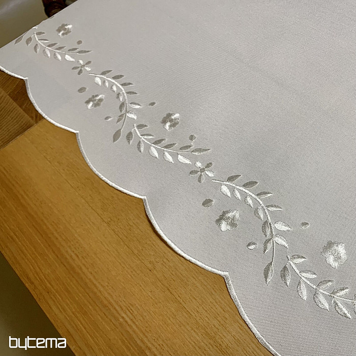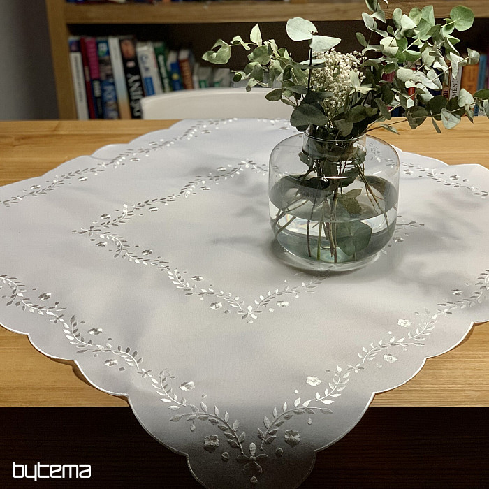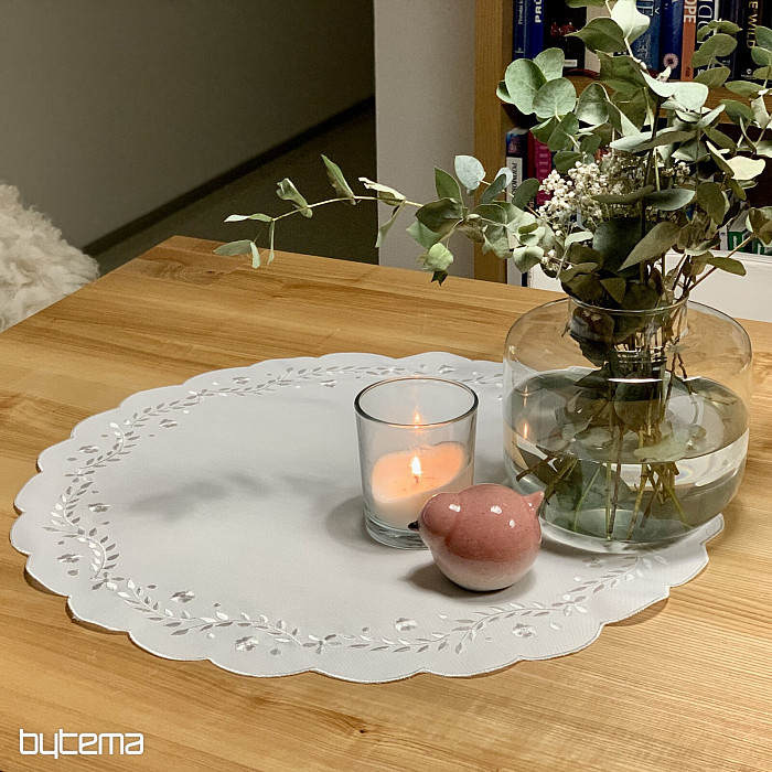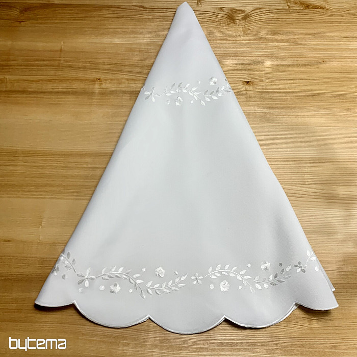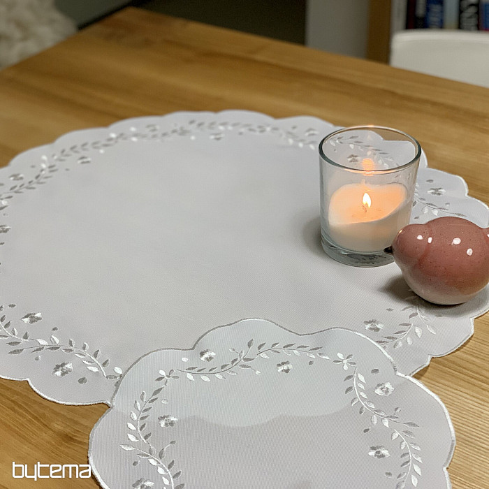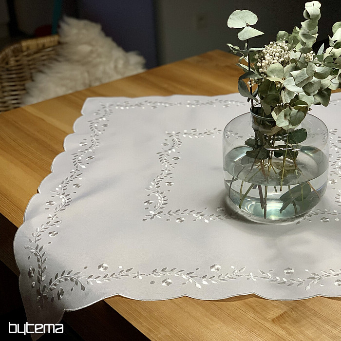 Nježan stolnjak izvezen ažurnim vezom, prikladan za svečane prigode.