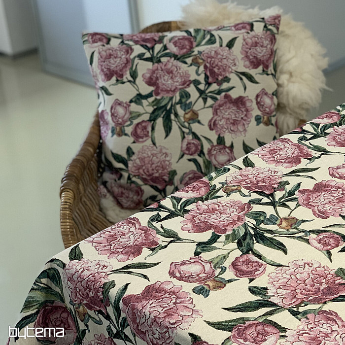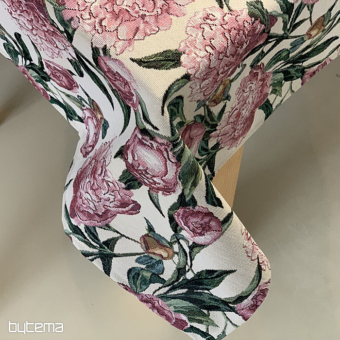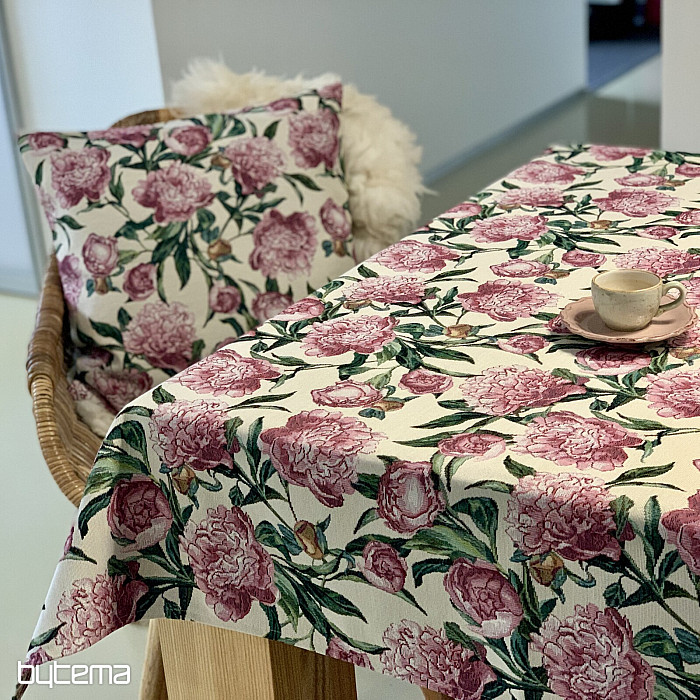 Prekrasan tapiserijski stolnjak ili šal s velikim ružičastim cvjetovima božura na vašem stolu. Nježan i romantičan ukras u vašem domu jamčit će udobnost i mir.
