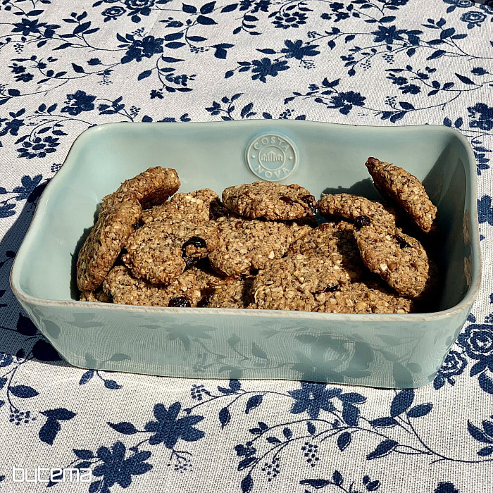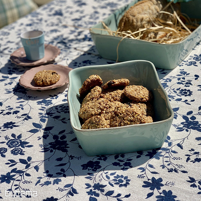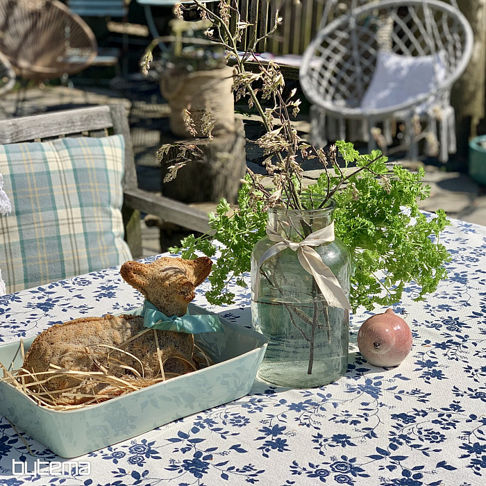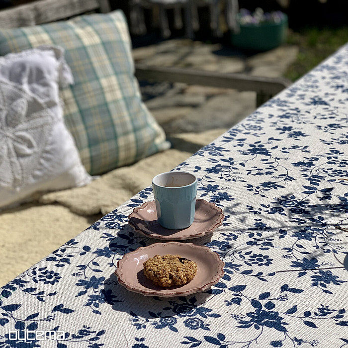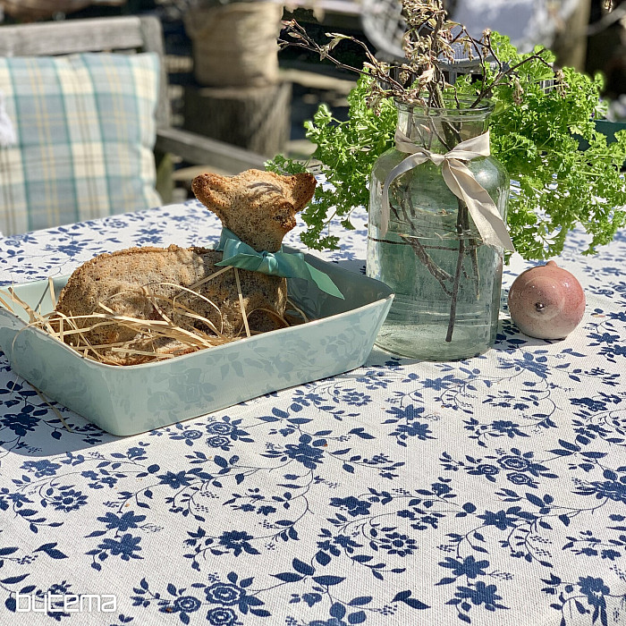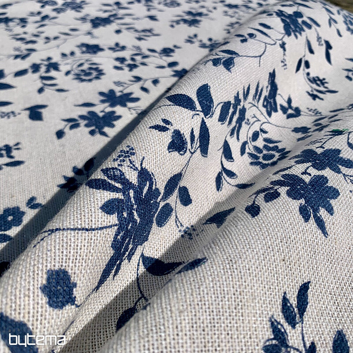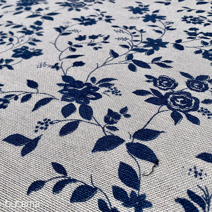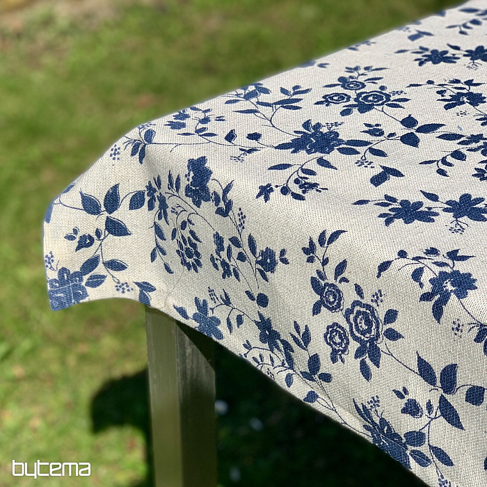 Prekrasan uzorak tamnoplavog cvijeća na krem pozadini i jedinstveni materijal s mješavinom lana, luksuzni stolnjak BLUE ROMANCE.