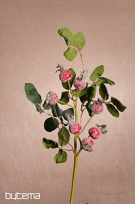 Dekoracija za zimsku sezonu. Na grančici dugoj 46 cm nalazi se sedam velikih šipka i mnogo listova. Grančica je prekrivena snijegom i lijepo izgleda.