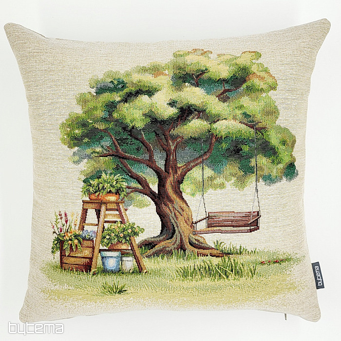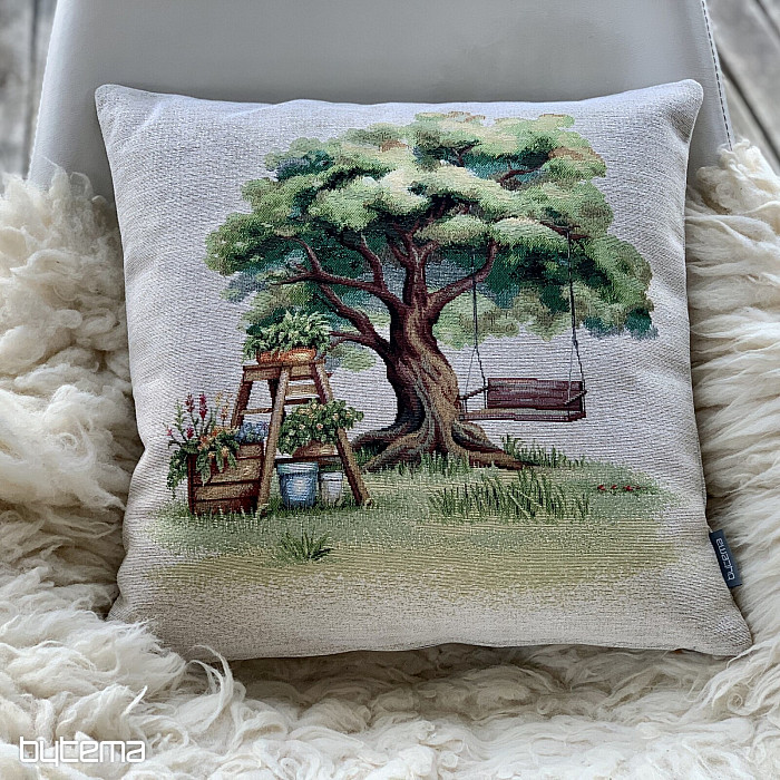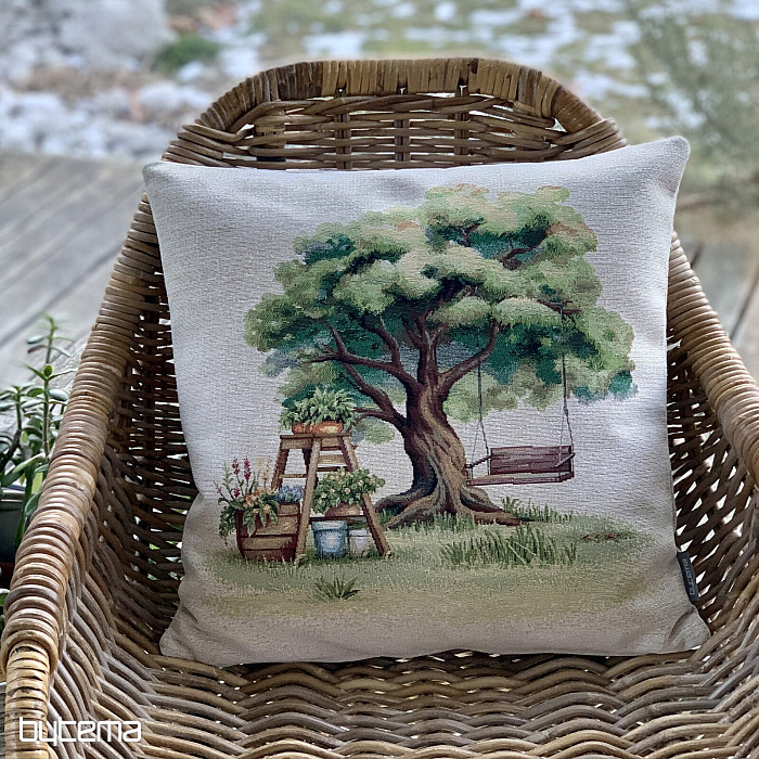 Tapiserijska jastučnica s motivom kutka za opuštanje. Ljuljačka ispod krošnji drveća idealna je za opuštanje.
