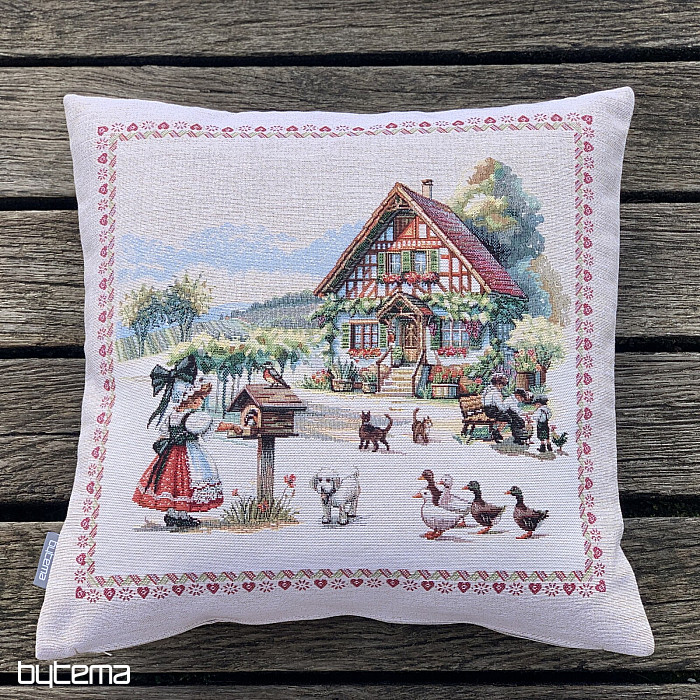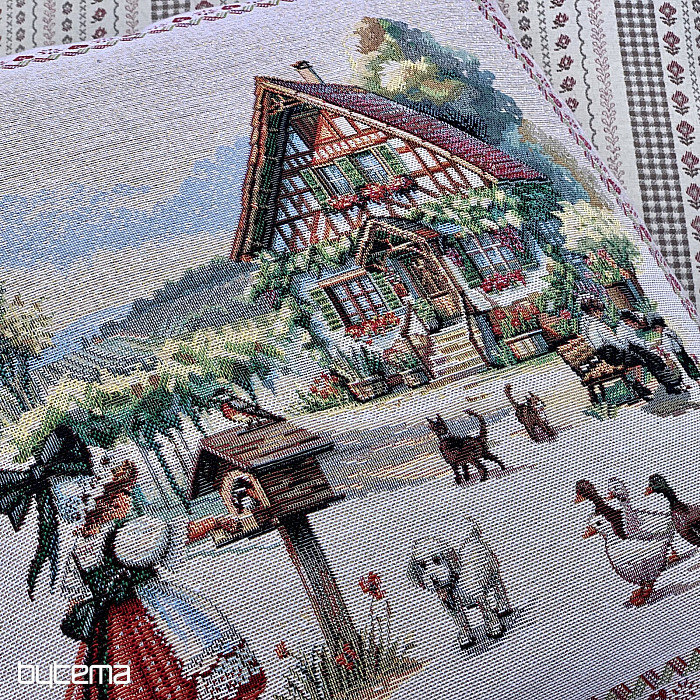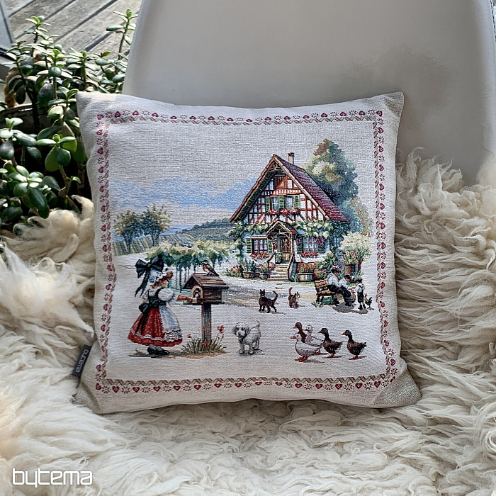 Tapiserijska jastučnica s dizajnom seoske kuće i dvorišta punog životinja. Prekrasan i poetski ukras za sve koji vole ovaj krajolik.