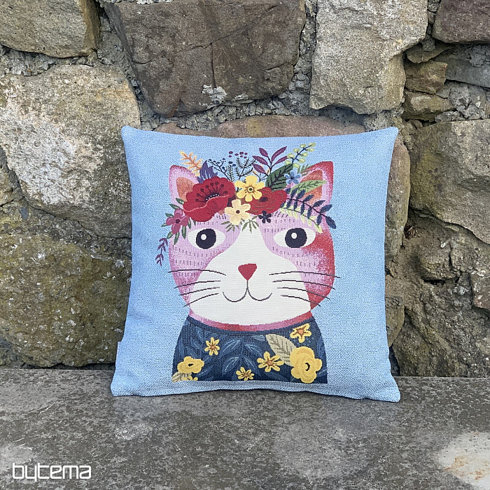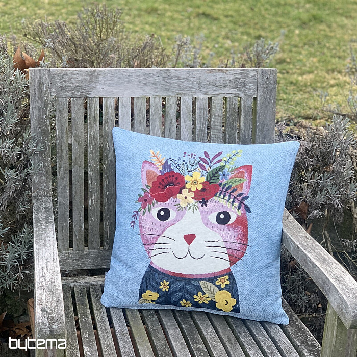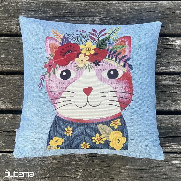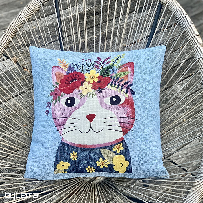 Navlaka za tapiseriju s motivom šarene mačke na plavoj pozadini.