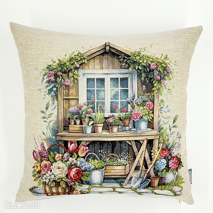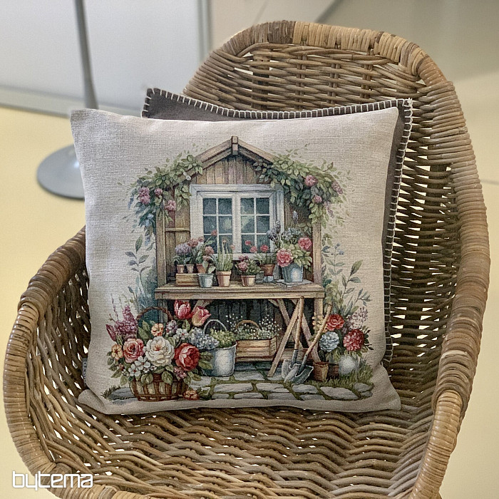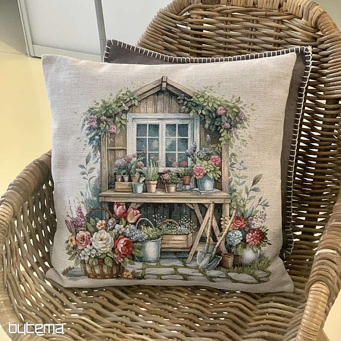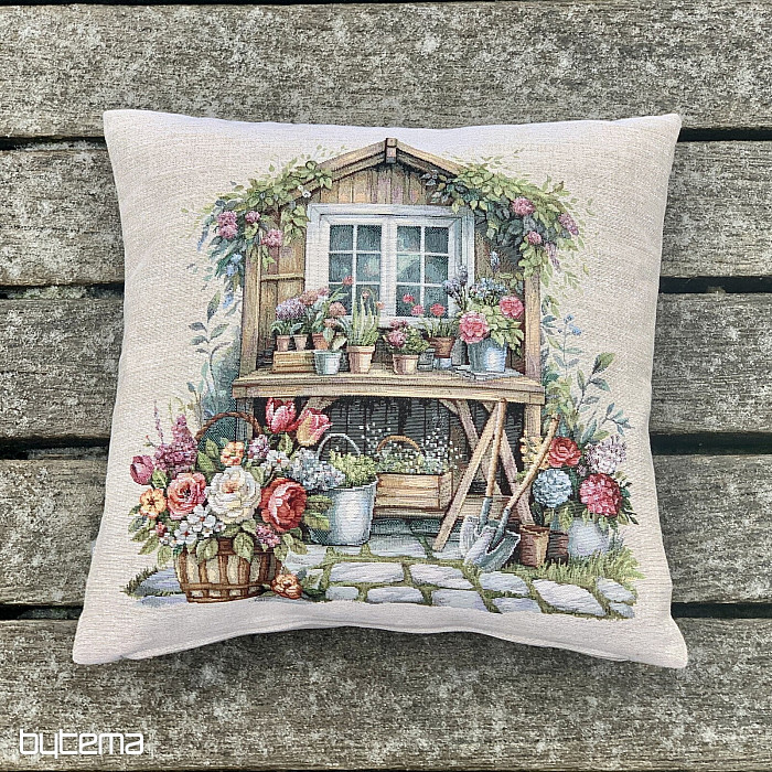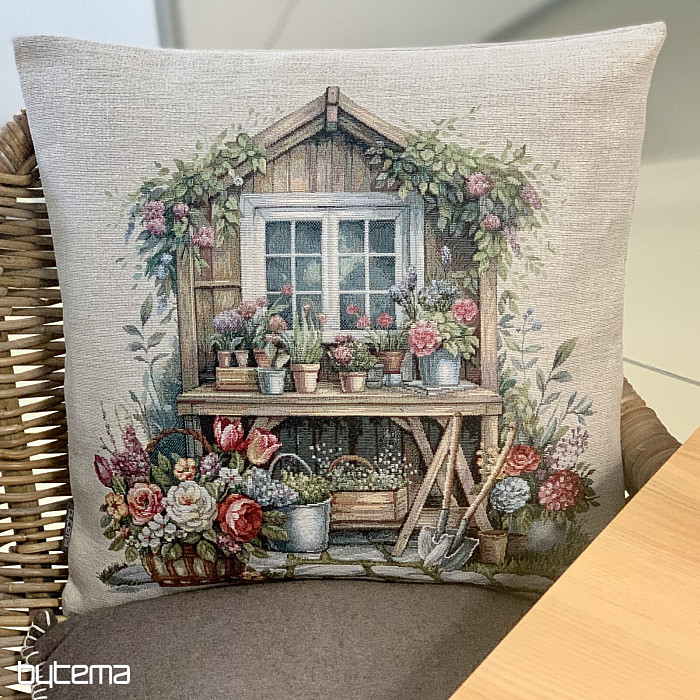 Tapiserijska jastučnica s vrtnom kućicom punom cvijeća. Uzorak na navlaki odiše proljetnom udobnošću i toplinom.