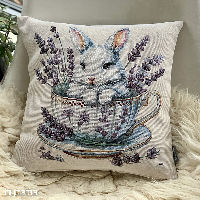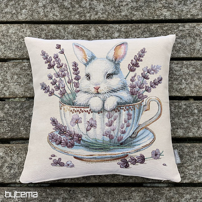 Tapiserijska jastučnica sa slatkim zečićem u porculanskom servisu s mirisnom lavandom okolo. Prekrasan i nježan ukras ne samo za uskrsno vrijeme.