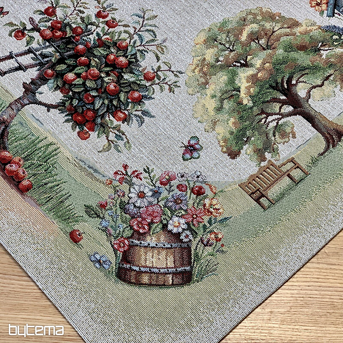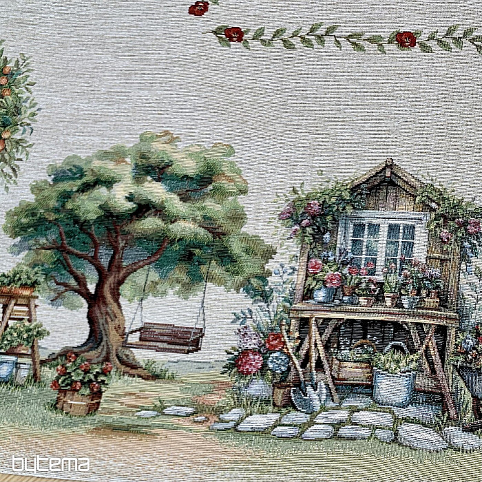 Tapiserijski stolnjak i šal s vrtnom kućicom punom cvijeća. Na prvi pogled, uzorak odiše proljetnom udobnošću i toplinom.