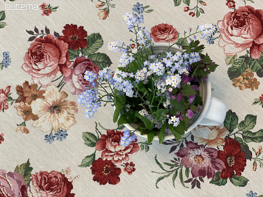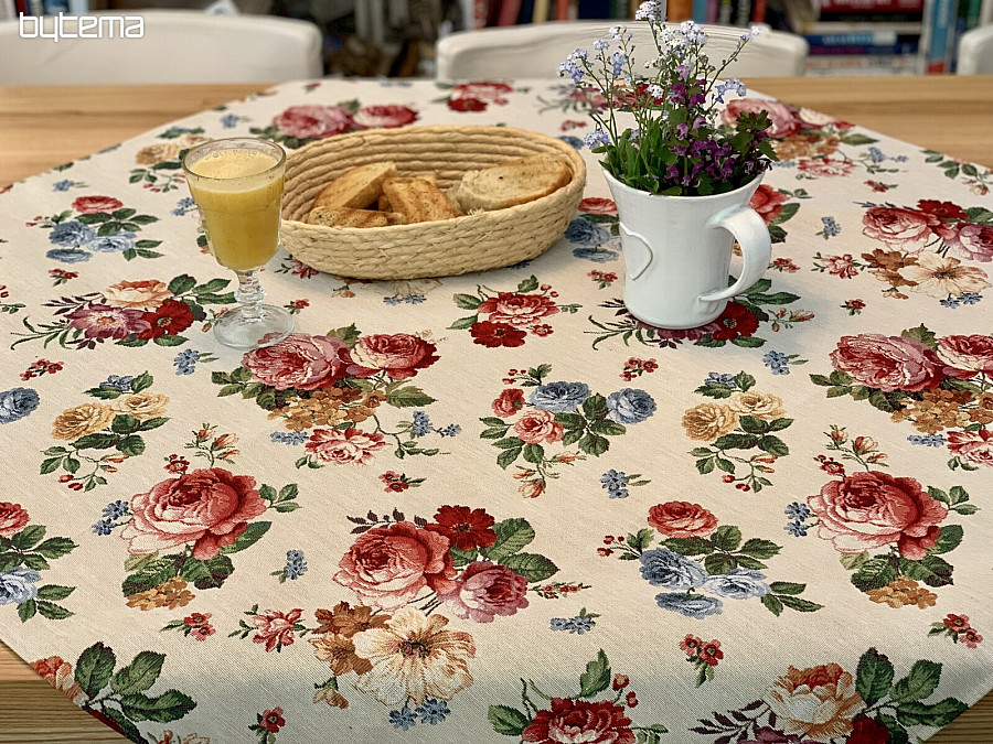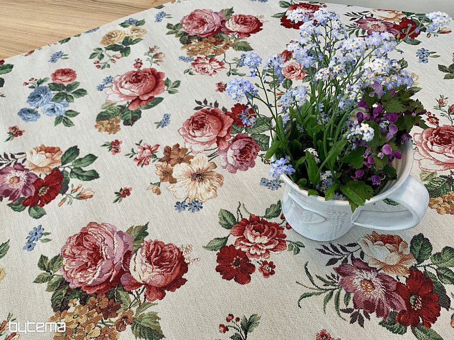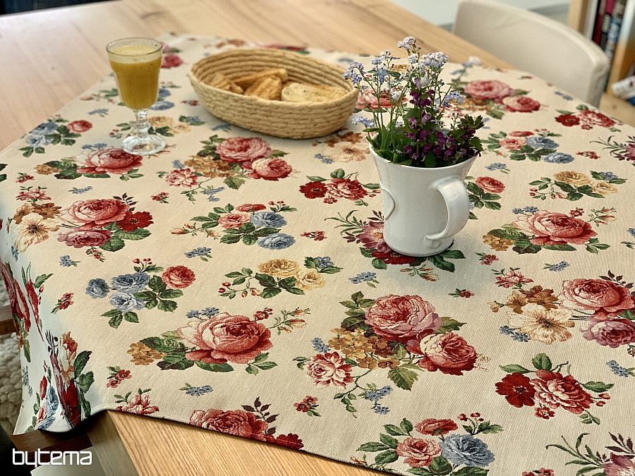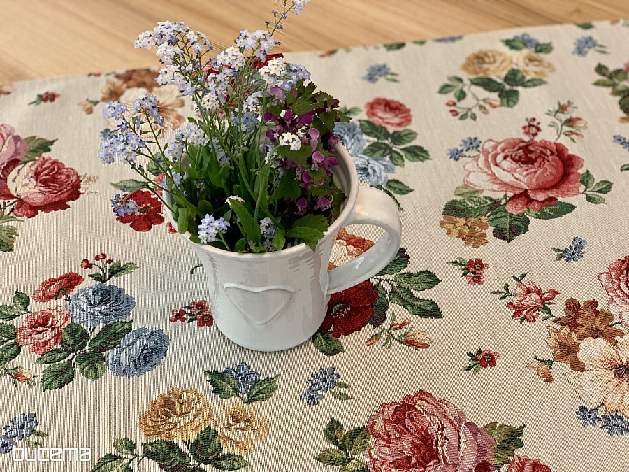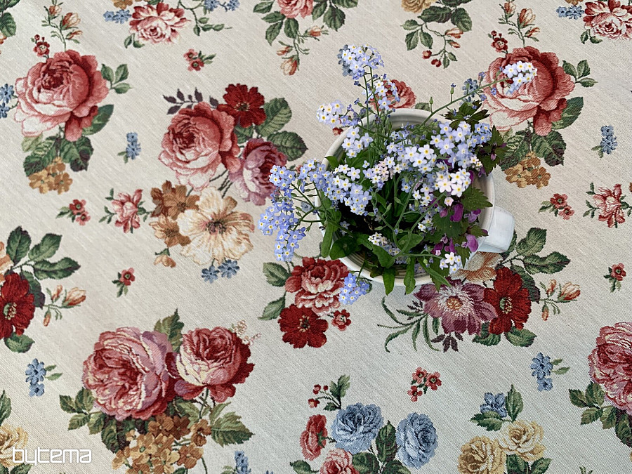 Tapiserijski stolnjak s romantičnim buketom ruža na svijetloj pozadini oduševit će sve ljubitelje stila dvorca. Nudimo ukrasne jastuke koji se slažu s njim, a također i izradu u nestandardnim dimenzijama. Samo isprobajte naš kalkulator.