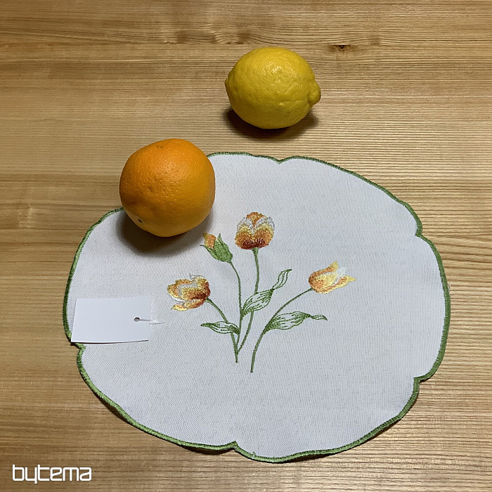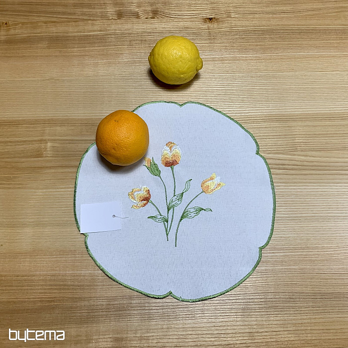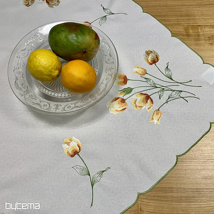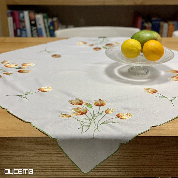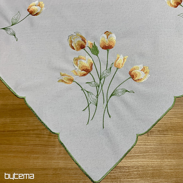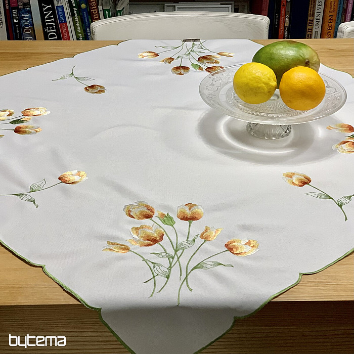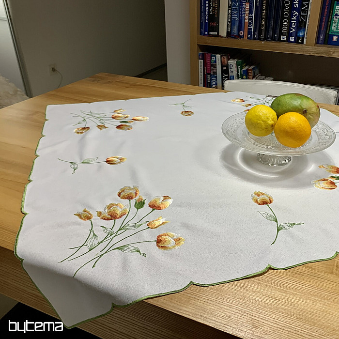 Vezeni stolnjak i šal s motivom narančastih tulipana, prekrasan vez omiljenog proljetnog cvijeća.